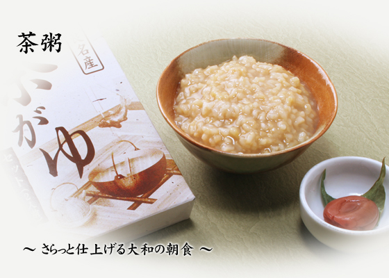 奈良の茶粥の歴史は古く、鎌倉時代には僧侶の間で食され、後に庶民に広まりました。大和では茶粥を「おかいさん」と呼ばれていて、昭和30年代頃までは「奈良の朝は茶粥で始まる」といわれるほど、奈良県とその近隣地域ではどこの家庭でも毎日食べる主食でした。茶粥は「ちゃん袋」と呼ばれる木綿の袋に日本茶(ほうじ茶)を入れて炊きだし、そこに米を入れて煮たものです。粘りが出ないようにさらっと炊きあげ、ねばりのないのが特徴で、季節によりさつまいも、栗、小豆、そらまめを入れて煮たり、夏は冷やして食べることもあります。