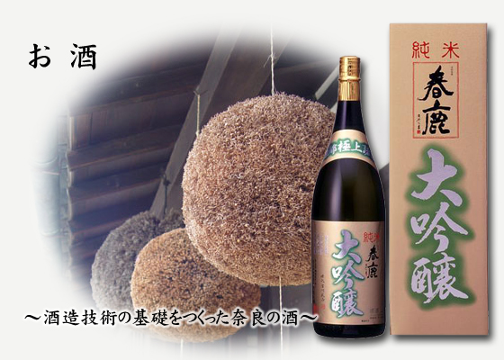 造り酒屋の軒に大きな杉玉が吊り下げられているのをよく見かけます。この杉玉は「志るしの杉玉(酒林・さかばやし)」といい、酒屋の看板とも言われます。酒造家は三輪山の神杉の葉を球状に束ねて作られた小型の杉玉を持ちかえり、酒造りのお守りとして酒蔵に祀り、新酒ができた印として軒先に吊るします。三輪明神は『枕草子』に"杉の御社"とあるように、杉は三輪を象徴するものです。この杉玉は、酒の神様として名高い奈良の大神(おおみわ)神社から授けられたものなのです。