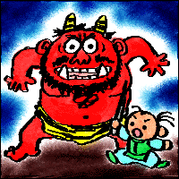 ある時、その家の娘と宮参りの旅をしていると、鬼が娘をさらいに来ました。一寸法師が娘を守ろうとすると、鬼は一気に一寸法師を飲み込んでしまいました。一寸法師は鬼の腹の中を針で刺すと、鬼は痛いから止めてくれと降参し、一寸法師を吹き出すと、持っていた打出の小槌を置いて山へ一目散に逃げていってしまいました。