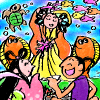 昔、昔あるところに浦島太郎という者が住んでいました。太郎は、毎日沖へ出ては釣り糸を垂らしていました。ある日のこと、浜辺を歩いていると一匹の亀が子供達にいじめられていました。太郎はかわいそうに思い、亀を助けてやりました。それから数日後、一人の女の人が舟で浜に漕ぎ寄せて、「自分は、姫の使いとして浦島太郎さんを迎えに来ました。亀を逃がしてくれたお礼をしたいと申しております。」と言いました。