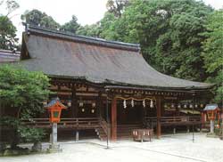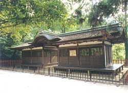 摂社としては、出雲建雄いづもたけお神社(延喜式内社)・天神社・七座社があります。尚、出雲建雄神社の拝殿、内山永久寺(現在廃寺)の鎮守社の拝殿を同寺廃絶後対象三年に移築したもので、中央に一間の「馬道(めどう)」と呼ぶ通路を開く割拝殿の典型的なものであり、国宝に指定されています。 末社としては境内に猿田彦神社・神田神社・祓戸はらえど神社、境外に恵比寿神社があります。 摂社出雲建雄神社拝殿(国宝) 拝殿(国宝)