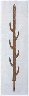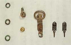 神宮には古代各氏族の王権を象徴する神宝を始め、大和朝廷の数を多くの神宝類が天神庫あめのほくらに保管されていました。その量ははかり知れないほどの莫大な量であったと考えられ、下って「日本後記」には、平安時代初期の延暦二十四(八百五)年に当神宮の器仗を山城国葛野郡に遷すのに十五万七千余人の人員を要したと記されています。しかし、中世以降衰退の一途を辿り、戦国時代の織田尾張勢の乱入や度々の盗難によって多くの宝物が散逸しました。 現在残っているものは少量ですが貴重なものが多く、古代の日朝関係を考察する上で不可欠な七支刀(国宝)を始め、鉄盾(重文)、足利尊氏奉納と伝えられる兜を具した色々威腹巻いろいろおどしはらまき(重文)更に禁足地発掘により出土した勾玉・管玉・環頭大刀柄頭等(重文)が神庫ほくらに収蔵されています。 尚、毎年大晦日には、神庫の守護神を祀り、その安泰を祈る神倉祭が斎行されてます。 鉄盾(重文) 七支刀(国宝) 硬玉勾玉(重文) 環頭大刀柄頭(重文)